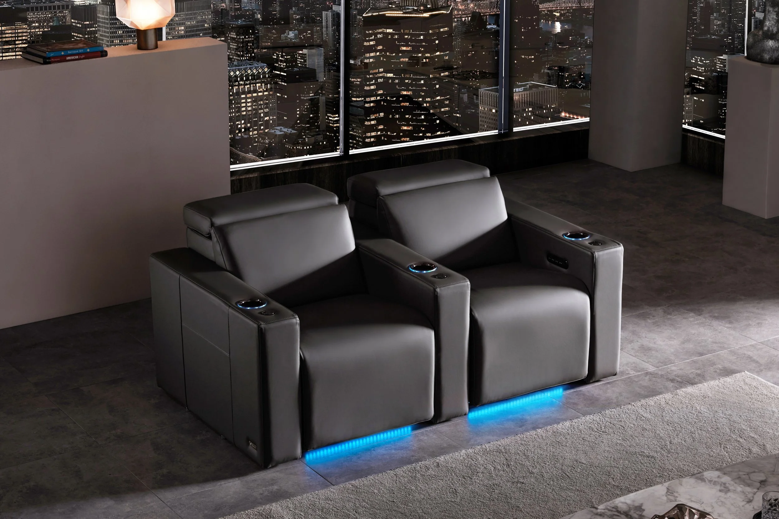 The second row will consist of 4 Valencia Loveseat Center Tuscany Home Theater Seats with Riser in Black. Elevated on a 7-inch (h) riser platform, these power zero-wall recliners are made of Italian Nappa 11000 Top Grain Leather with diamond stitching, and boast a power headrest and lumbar, hidden armrest storage, LED backlit cupholders, LED Ambient lighting and a tactile controller.