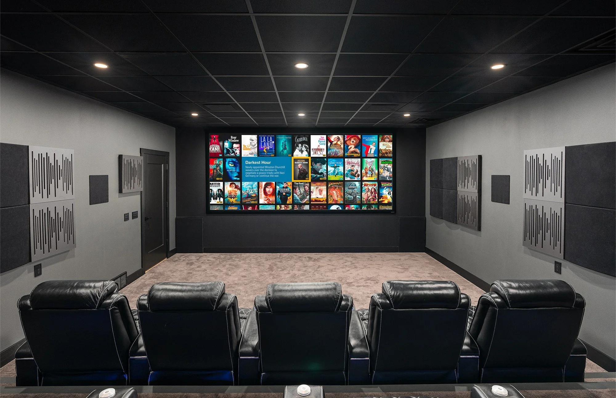 Valencia Home Theater Seating’s Barcelona Ultimate Luxury Edition Loveseats in Onyx will adorn the front row of SR11. 100% draped in Semi-Aniline Italian Nappa Leather 20,000, these power zero-wall recliners include power headrest and lumbar, memory control panel, stainless steel chrome cup holders, and low-profile-low-rise backrests for unobstructed sound and view.